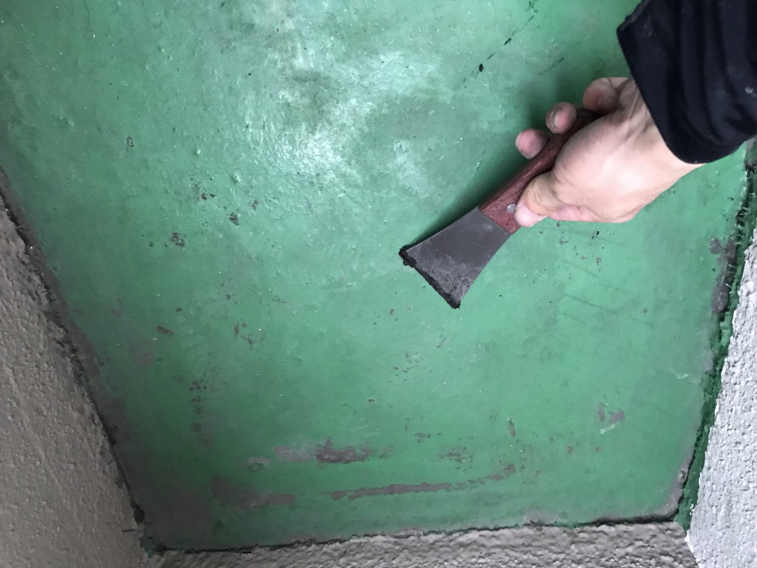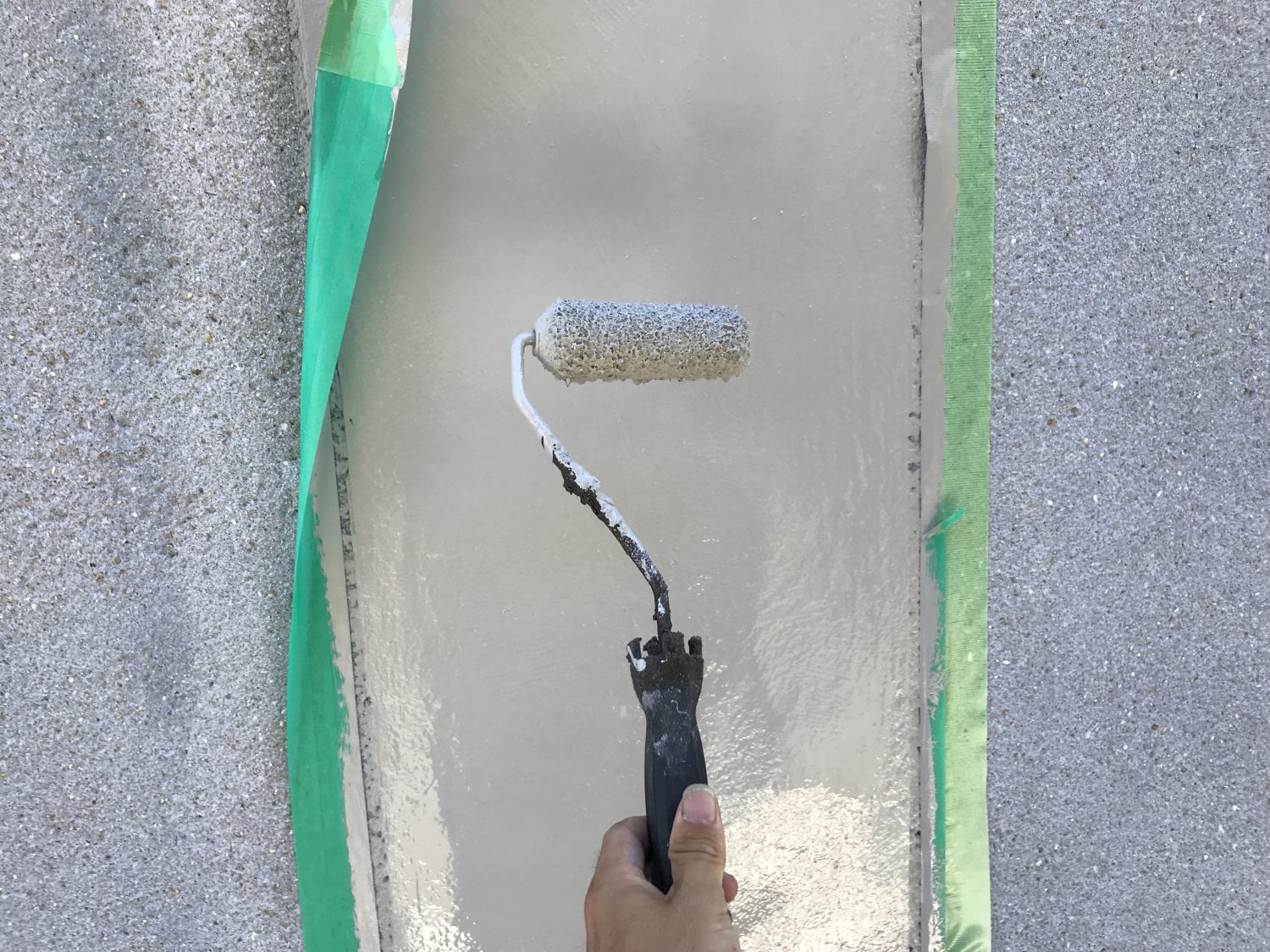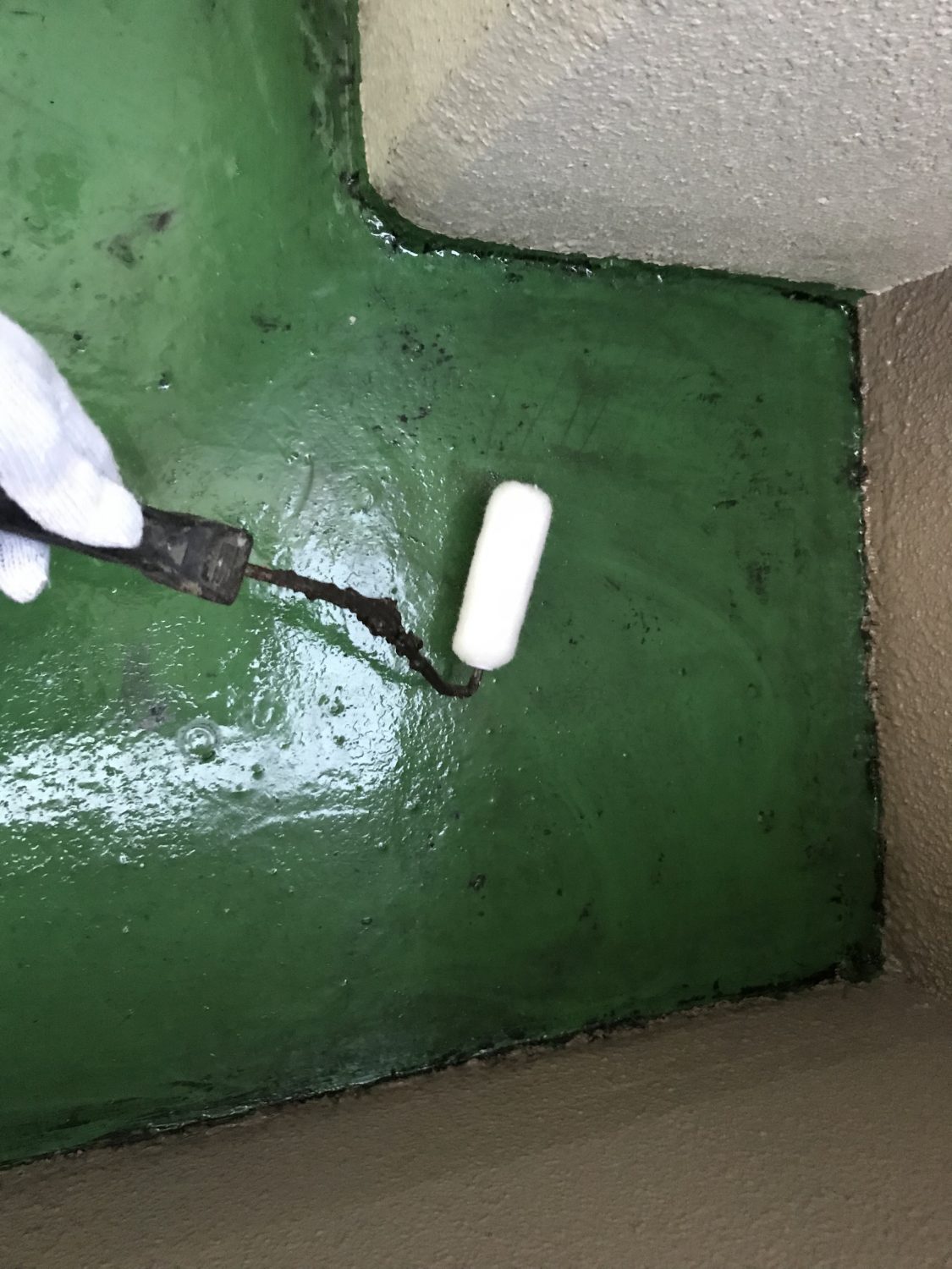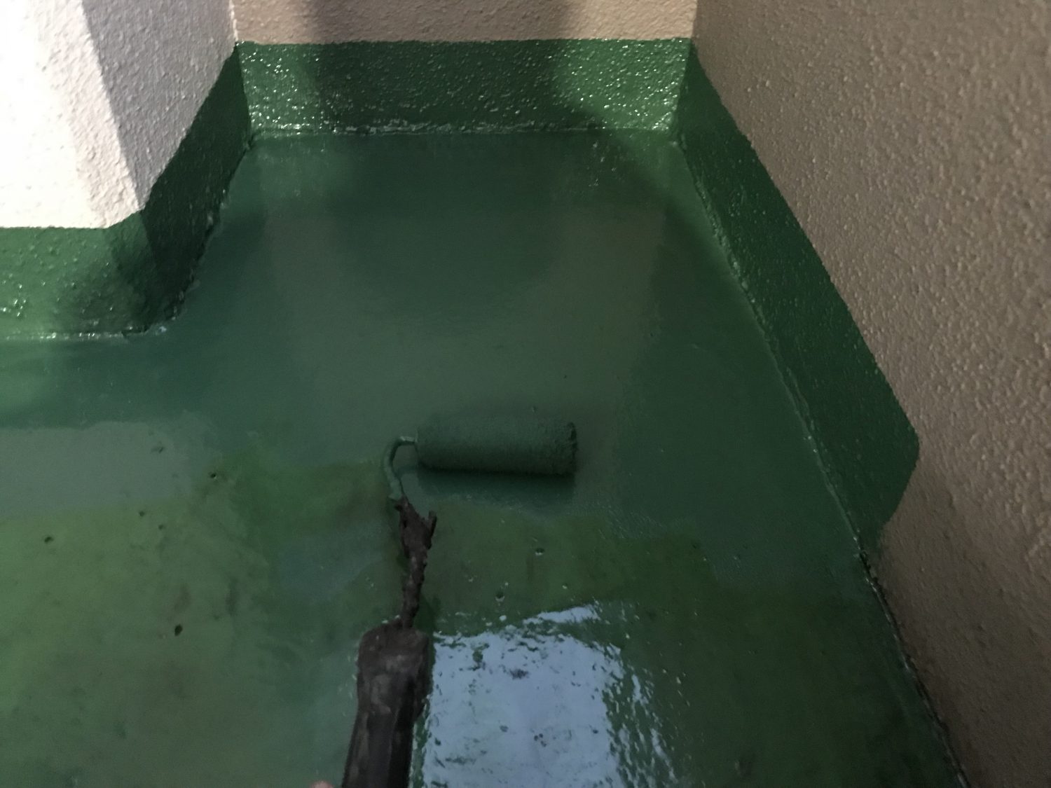 【防水材塗布】ウレタン防水を使用し膜厚(防水層の厚み)確保のため2層塗布しております。二層目