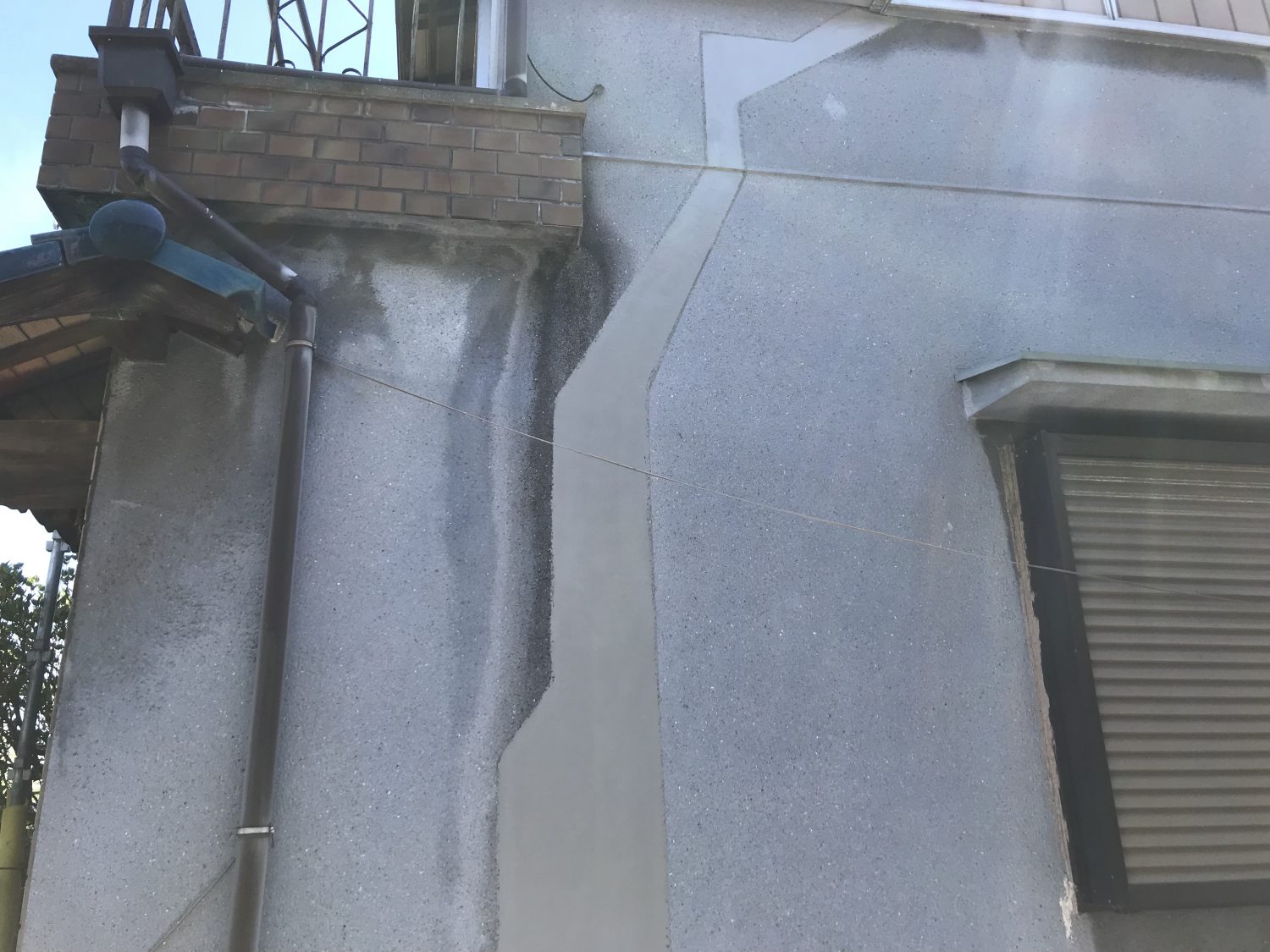 バルコニー1部剥落、外壁1部に大きなひび割れとのご依頼を受け、足場を組んでの工事をさせていただきました。